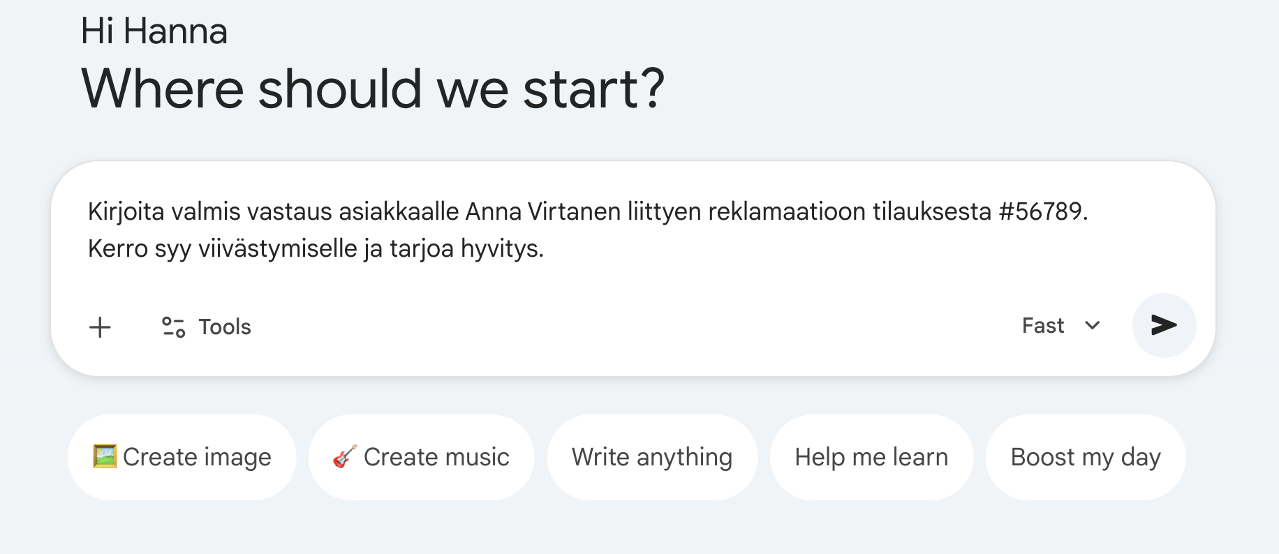“Kirjoita luonnos vastaukseksi asiakkaan reklamaatioon myöhästyneestä toimituksesta. Sävy asiallinen ja ratkaisukeskeinen.”